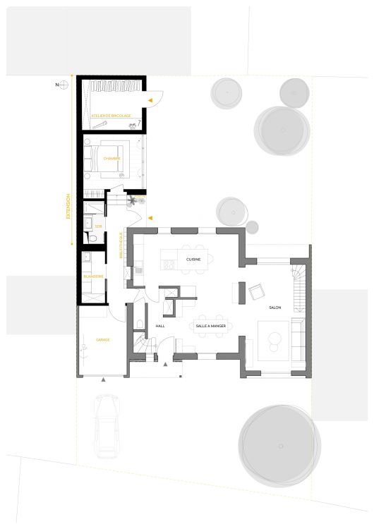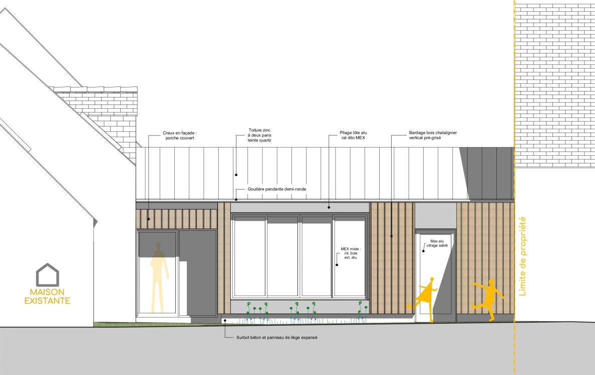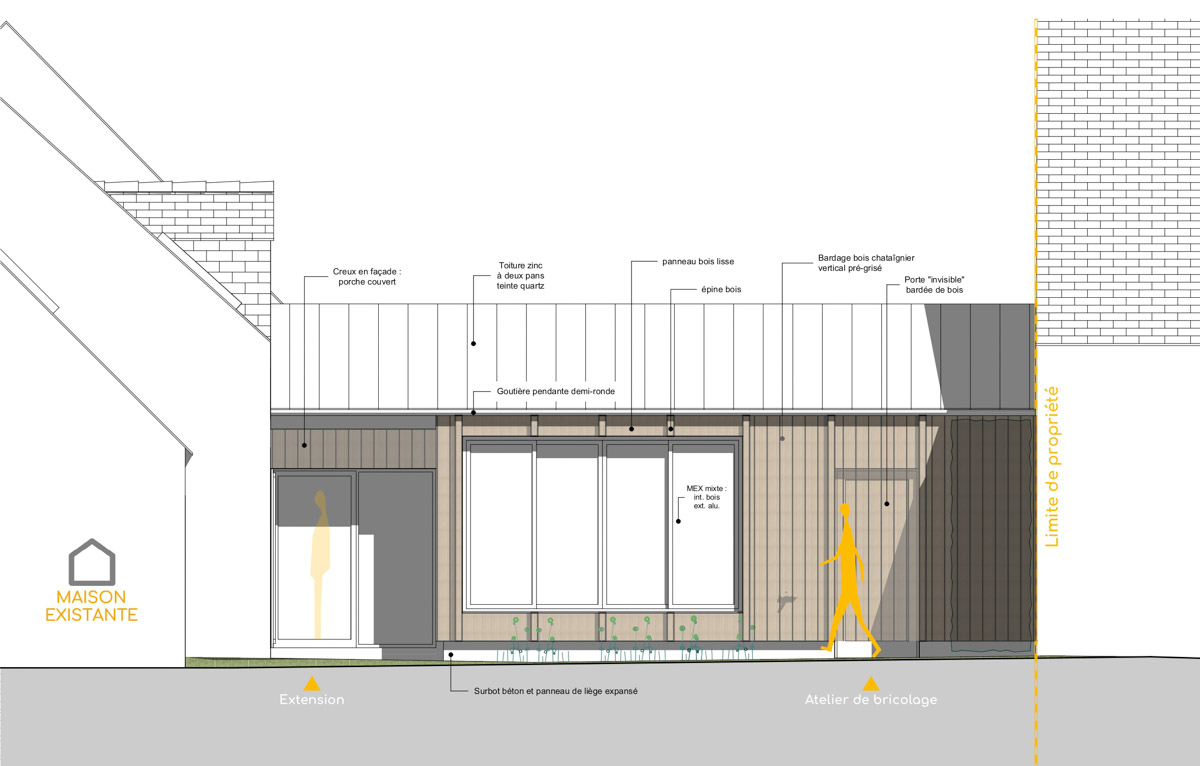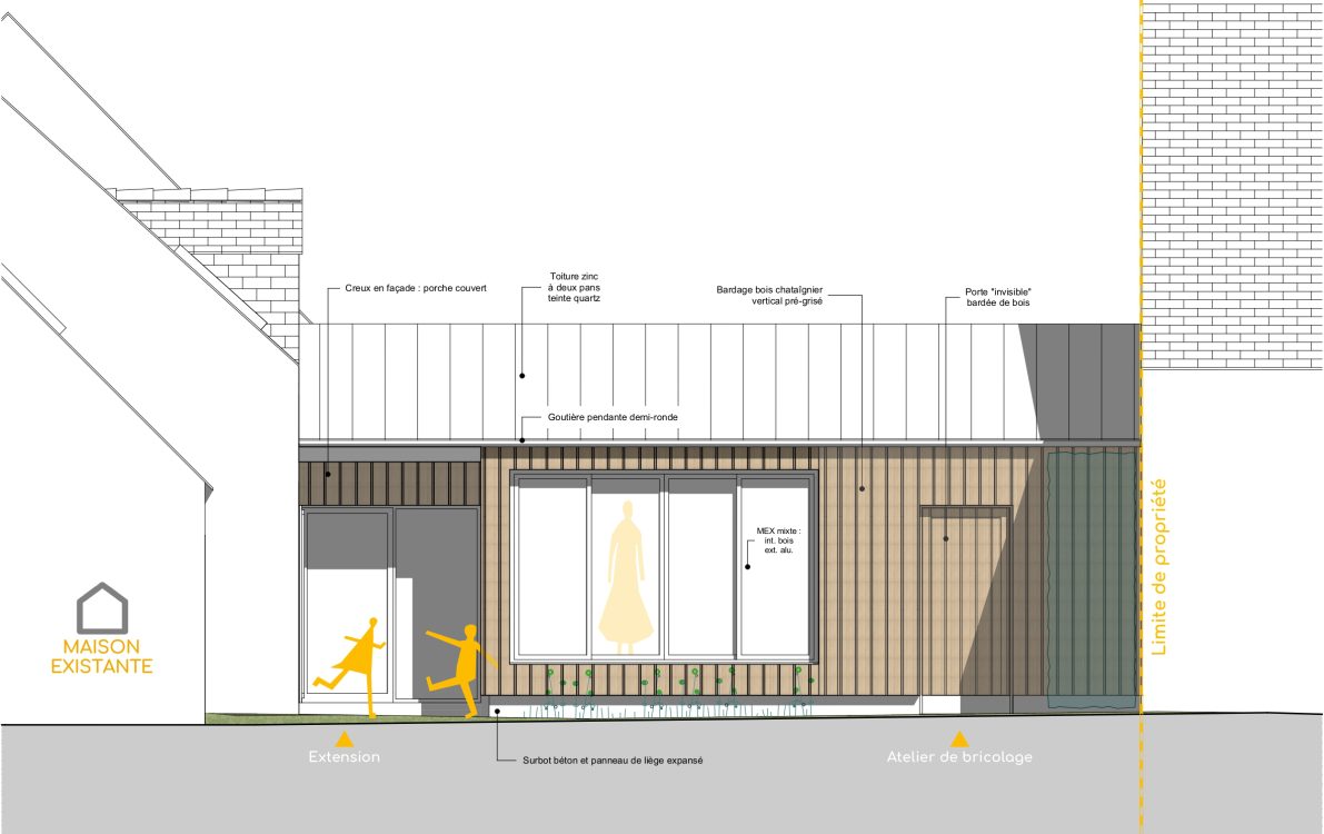 La famille s’agrandit : l’existant évolue. Les clients souhaitaient une chambre parentale en RdC ainsi qu’un atelier de bricolage en lien avec les extérieurs. L’extension en ossature bois et bardage bois s’installe en limite et vient se tourner vers le jardin. Sa volumétrie sobre et épurée permet une insertion discrète par rapport à la maison existante. La chambre s’ouvre généreusement vers le jardin paysagé et l’existant est légèrement remaniée pour assurer une connexion cohérente avec l’extension.