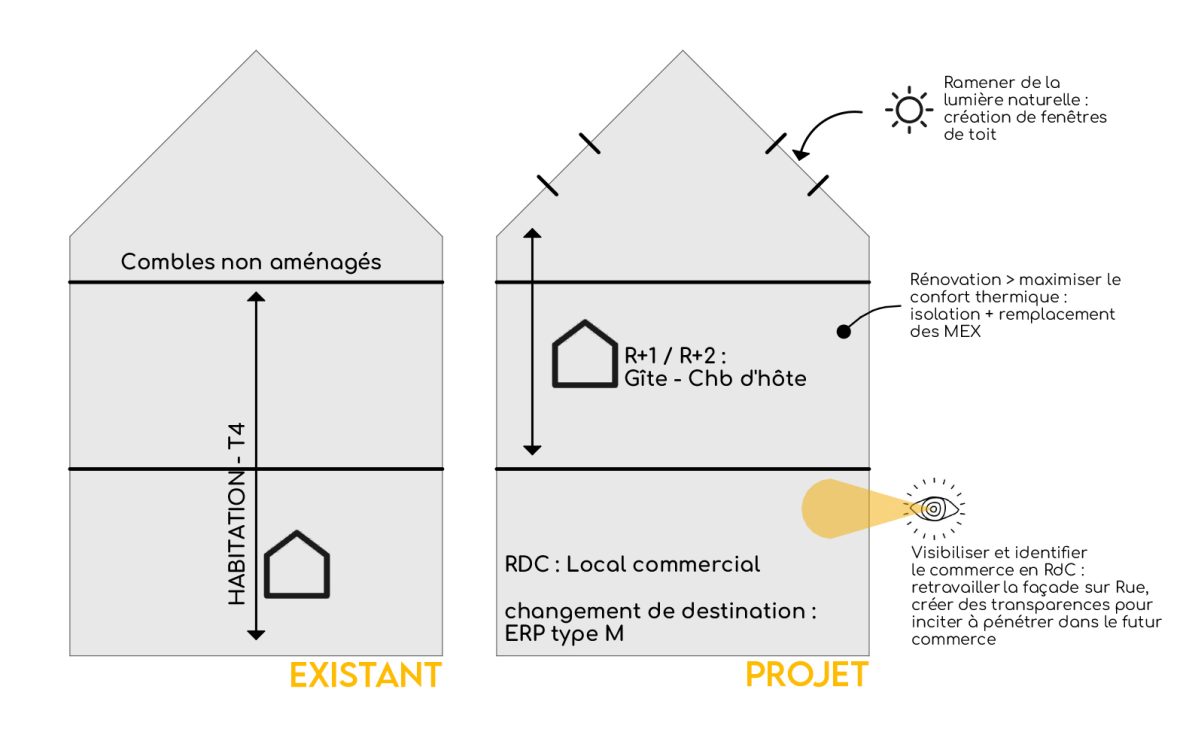 Ce projet de rénovation complète d’une maison en centre bourg en un local commercial en RdC et logement indépendant donne un second souffle à cette bâtisse pierre longtemps restée en sommeil. La façade du RdC commercial est retravaillée pour créer des transparences et identifier le commerce depuis la Rue commerçante. Les étages sont rénovés pour accueillir un logement confortable et lumineux.